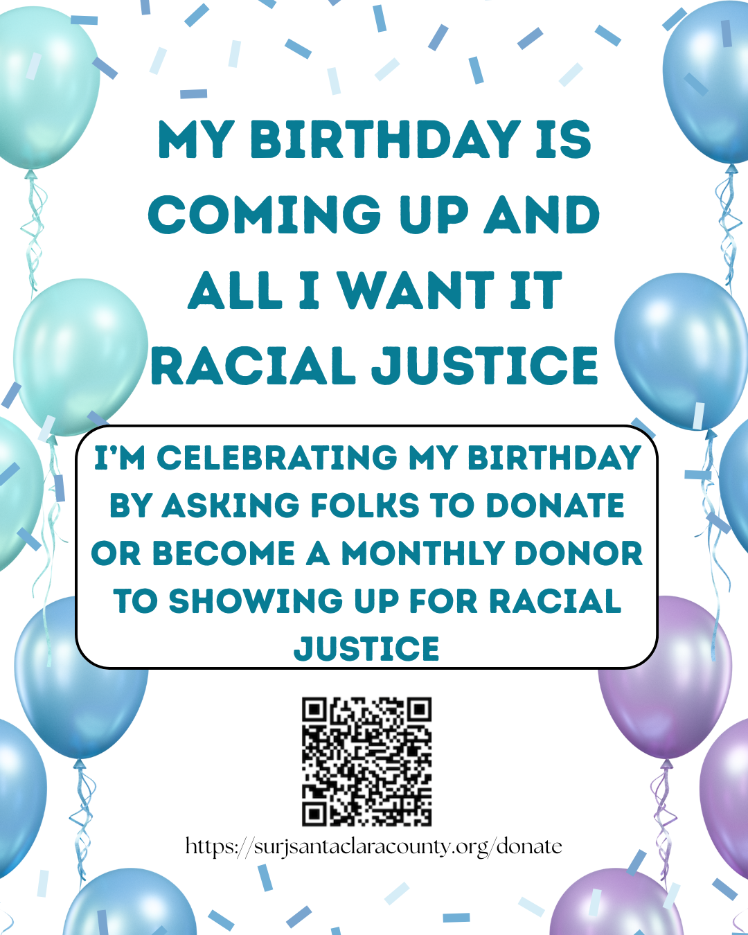 To donate, please go to our SURJ Santa Clara County donate link. Or if you have a birthday coming up, consider asking your loved ones to become monthly donors as a birthday present. :)